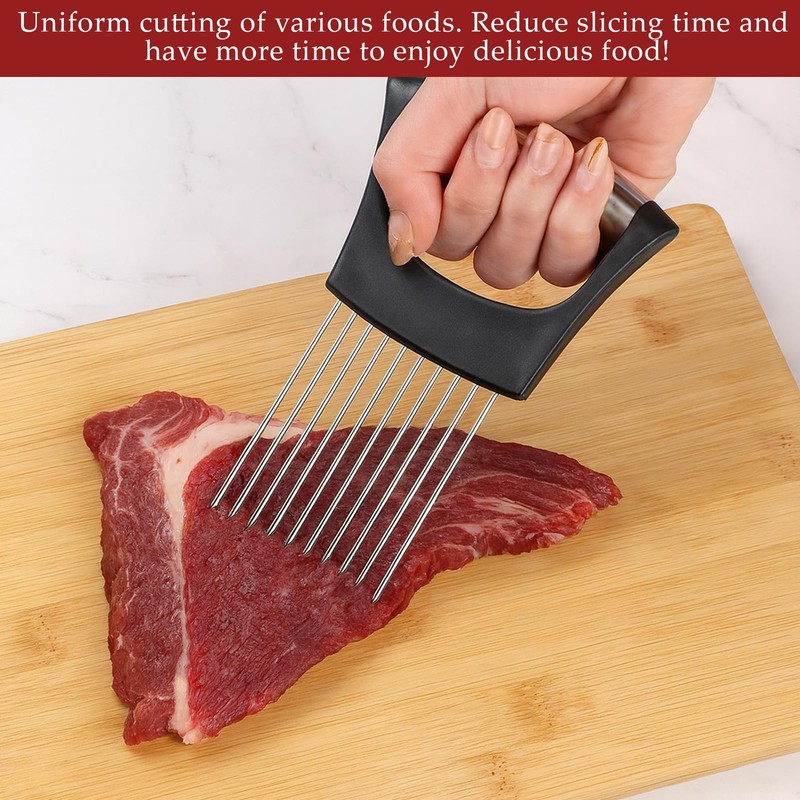 - Versatile Kitchen Tool: More than just an onion slicer, this kitchen gadgets is perfect for a wide variety of fruits, vegetables, and meats. Its sturdy design and sharp prongs make slicing quick and easy.