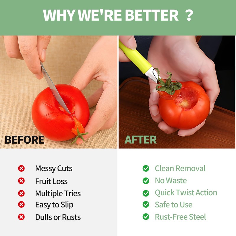 Our innovative tool features a sharp, serrated stainless steel tip that pierces and twists through tomatoes, strawberries, and more in seconds, neatly removing stems and cores without damaging precious flesh.