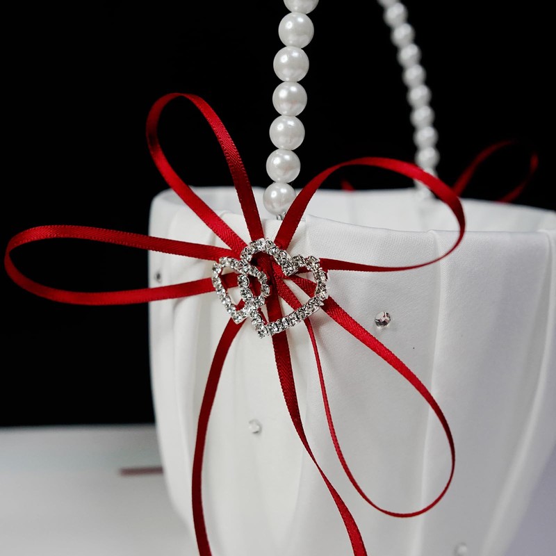 2 Pcs Wedding Flower Girl Baskets, Double Heart Flower Storage Basket with Cute Pearl Handle Bowknot for Wedding Ceremony (Red)