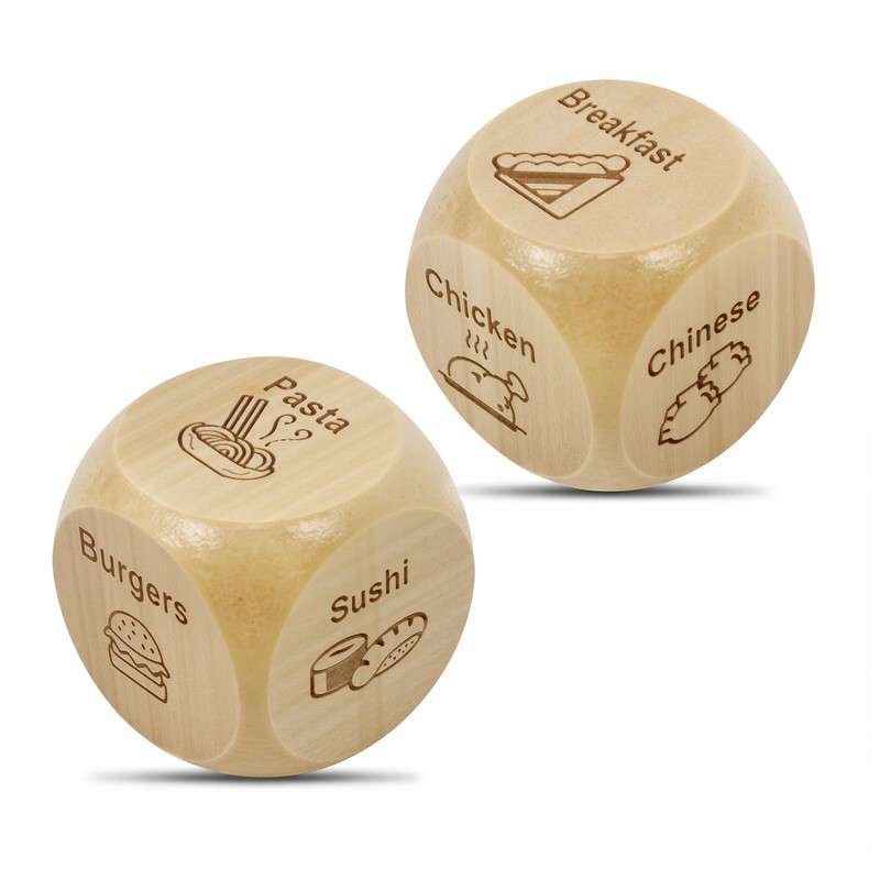 - Food Decision Dice are made of high-quality wood in 1.2 inch size, lightweight, durable, and portable.The corners are round and smooth, the engraving pattern is clear, and it is not easy to wear and crack.