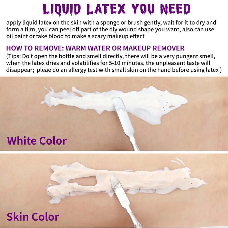 - Fake skin: professional liquid latex for creating special make-up, dries transparently, his zombies, Halloween, wounds, scars, FX make-up good helper.