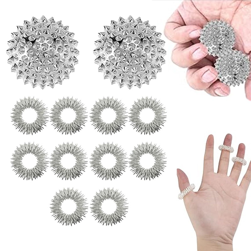 - Set: the acupressure ball set, consisting of 2 metal hedgehog balls and 10 massage bracelets, helps to improve blood circulation, relieve muscle tension and promote sensory and physical relaxation