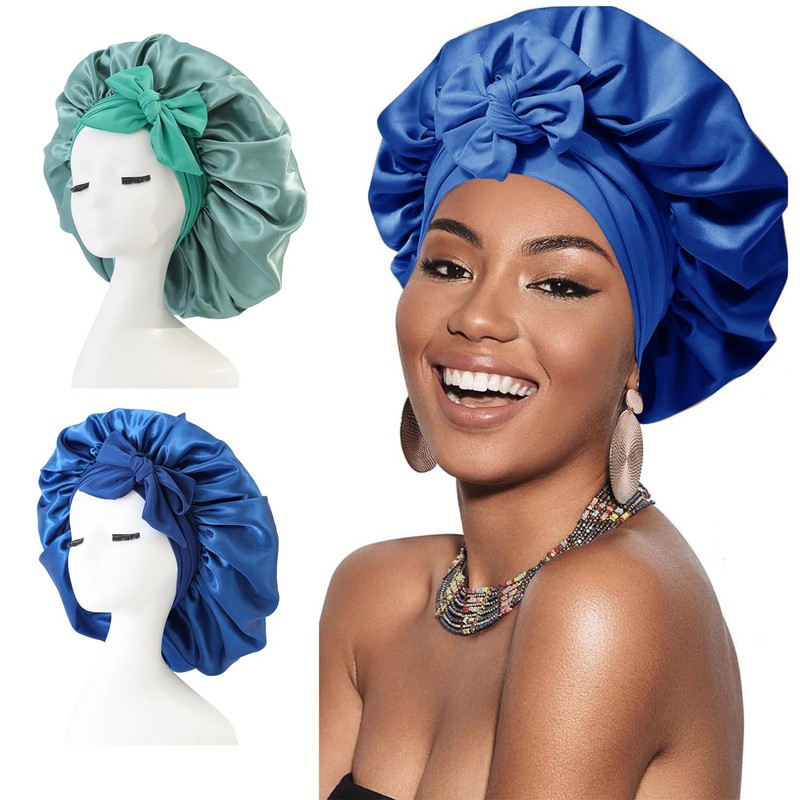 2 Piezas Gorro de Satin para Dormir, Ajustable Gorra de Seda para Dormir, Gorro de Satin para Dormir Cabello Rizado, Azul y Verde