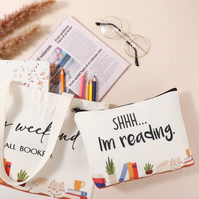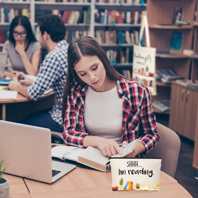 2 Regalos para Amantes de Libros Bolsa de Asas de Estantería de Lona Maquillaje Reutilizable Estuche con Cremallera de Metal