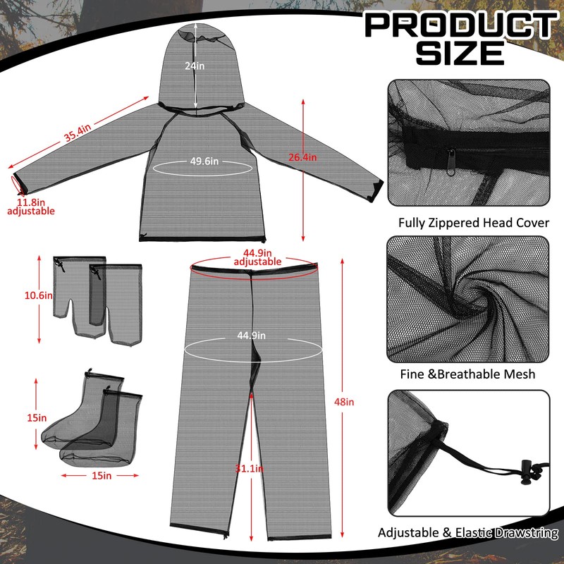 - What You Will Receive: the package contains 2 sets of fine mesh full body clothing, namely 2 piece of net jackets with hood, 2 pieces of net pants, 2 pairs of mittens and 2 pairs of socks, providing full protection during camping, hiking, gardening, fishing and so on