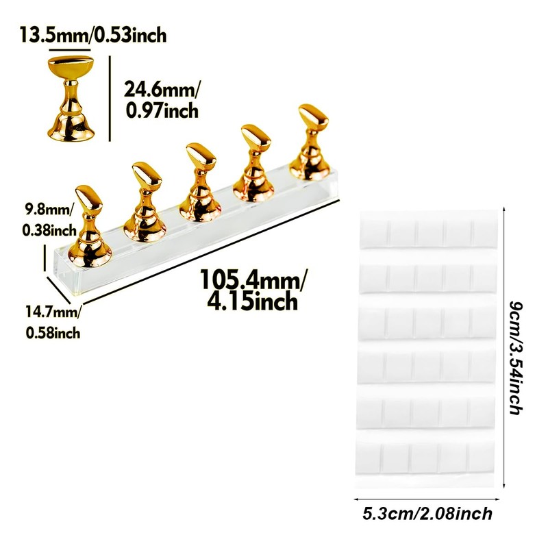 - What You Get: You will get 2 sets of gold nail art stands, each set includes 1 crystal acrylic practice stand base and 5 nail art practice stands, In addition, there are 30 grids of white clay, a good combination for you to practice nail art DIY art