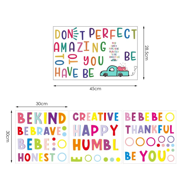 1. This product contains colourful inspirational wall stickers in different sizes and designs that are suitable for various wall decorations.