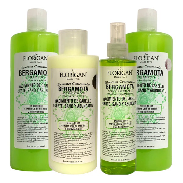 Shampoo Contra la Calvicie Elementos Concentrados Bergamota Florigan 1lt. Vitaminas B5 y B7- Favorece la estimulación y nutrición del folículo capilar para el crecimiento del cabello; protege, humecta y suaviza. Suministra mayor volumen y brillo. Evita la pérdida de la hebra capilar. Vitamina B6- Contribuye a la normalización de la secreción sebácea y al proceso de renovación celular. Vitamina B12- Restaura el cabello y previene la resequedad. Vitamina E- Disminuye la irritación del cuero cabelludo, aporta fuerza al interior de la hebra capilar. Eficaz antioxidante. Vitaminas F y C- Reduce puntas abiertas y ayuda a restaurar las fibras de colágeno. Protege de los rayos UVB. Cola de Caballo- Extracto rico en silicio que apoya en la formación de colágeno, aumenta el crecimiento y vigor del cabello. Mejora su textura. Bergamota- Previene la caída de cabello y promueve su crecimiento. Auxilia en problemas de seborrea. Nutre y fortalece. Nacimiento del cabello, fuerte, sano y abundante. Mejorado con extracto de Cola de Caballo y Multivitaminas.