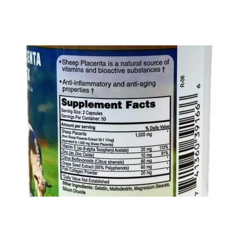 2 Sheep Placenta with Grape Seed, Collagen, Vitamin E Zinc 200 capsules total 741360391666