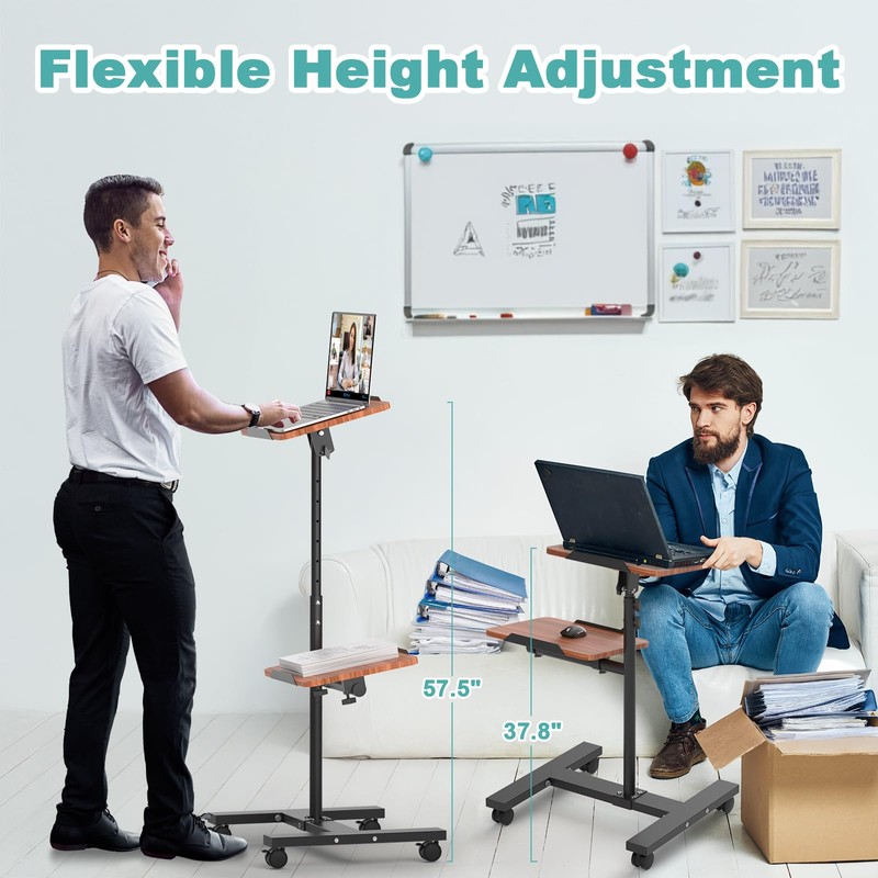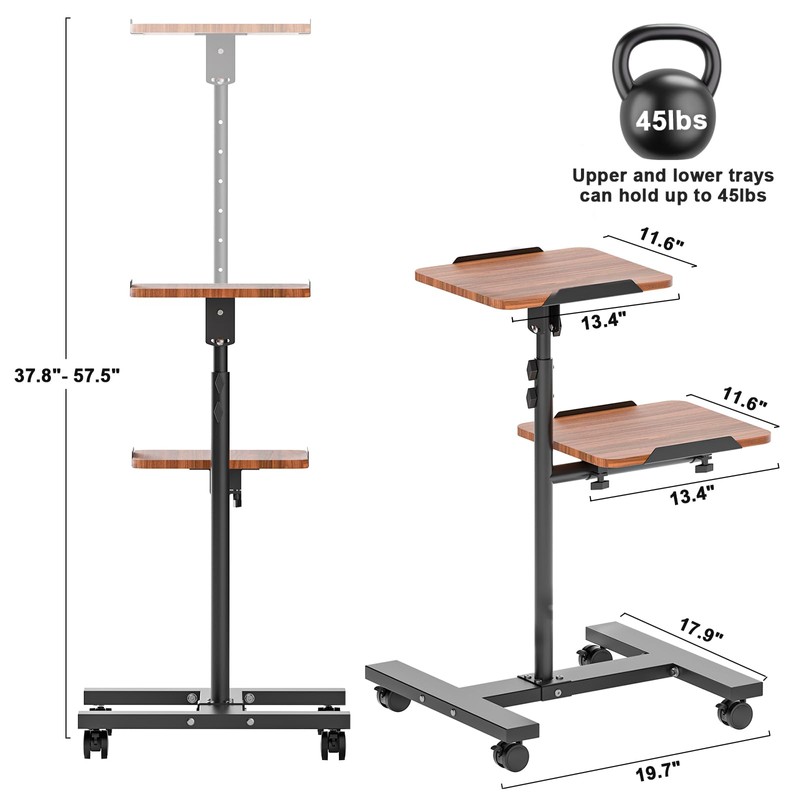 - Adjustable Height & Tilt: 11 levels of height adjustment, easily adjust the height from 37.8“-57.5”, 360° tilt on top tray, ±15° on bottom tray, two trays anti-skid strip on both sides design protects your equipment from slipping, Maximum load capacity is 88 lbs