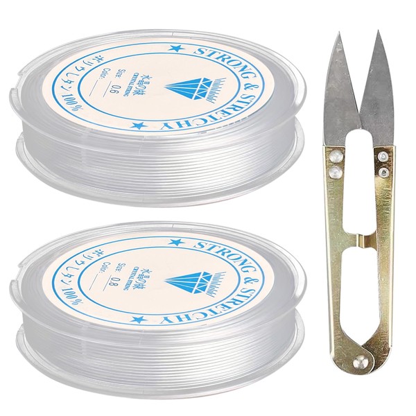 2 Spools of Elastic Bands for Bracelets, 0.6 mm x 15 m, 0.8 mm x 8 m with Scissors, Transparent Beads Thread Elastic Bracelets Making Yourself, String for Hanging Jewellery, Bracelet Making (Colour of