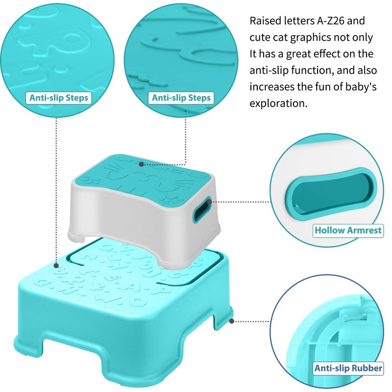 - ✅Safe & Sturdy:Kids step stool is made with thick plastic in grade A and designed with anti-slip feet surface in cute cat prints and ABC, Wide enough space for standing,also there are 8 pcs non-slip strip on the floor side, this is very safe and sturdy for kids.
