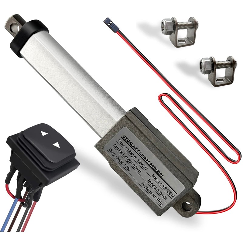 - ✅Linear Actuator With Momentary Switch Set: Our 42LB/188N 12VDC Linear Actuator Stroke is 2inch(50mm), speed is 0.2 inch/sec (5 mm/s), IP65 waterproof, made of metal material for indoor outdoors. And the waterproof DPDT reverse polarity switch controls linear actuator UP/DOWN.