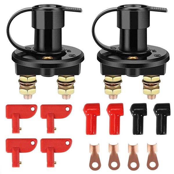 - ⚡【Verpackungsinhalt】Dieses Kit umfasst 2 Batterieschalter, 4 abnehmbare Schlüssel, 2 wasserdichte Abdeckungen, 4 Anschlussklemmen und 2 Isolationsabdeckungen. Schützen Sie Ihr Fahrzeug effektiv vor unnötigem Stromverbrauch.