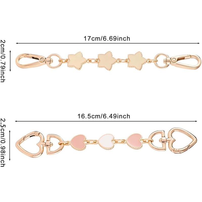 • Versatile Sizes: Offering a perfect fit for a range of handbags, purses, shoulder bags, and cross-body bags, these extender chains come in star and heart shapes, measuring approximately 6.69x0.79x0.19in/17x2x0.5cm and 6.49x0.98x0.19in/16.5x2.5x0.5cm, respectively.