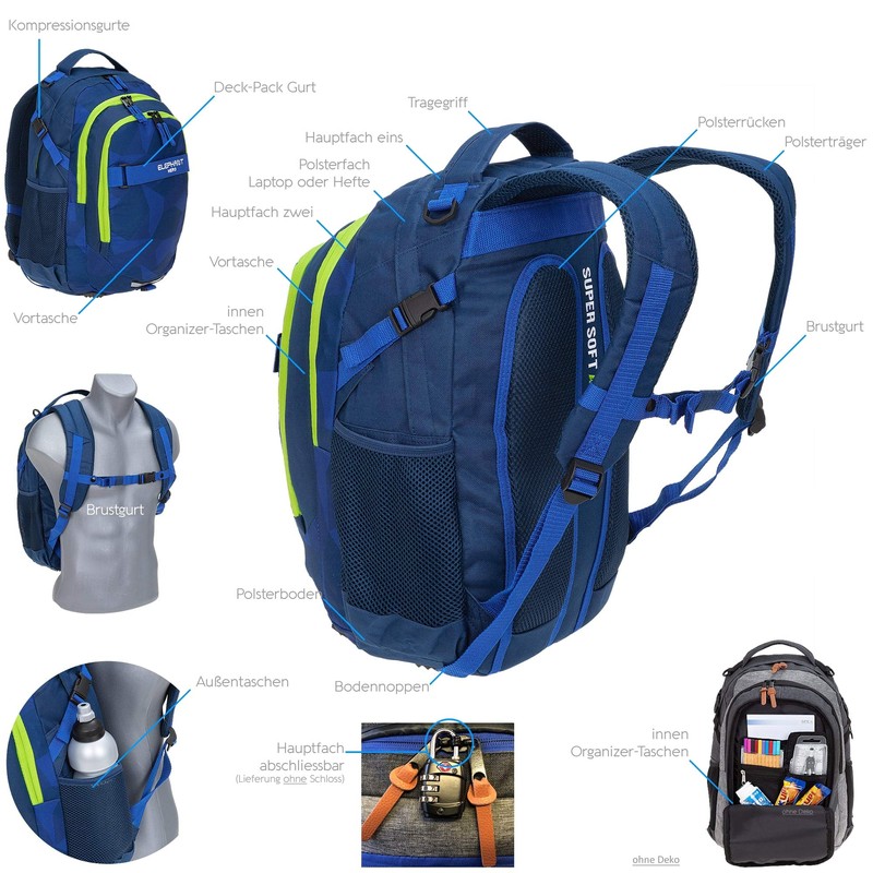 • Polstertasche innen, auch für Laptop bis 39 x 27 cm, Kompressionsgurte seitlich, breite Polstergurte, Polsterrücken, Brustgurt (abnehmbar), Bodennoppen, Einlegeboden im Hauptfach (Front gefüttert)