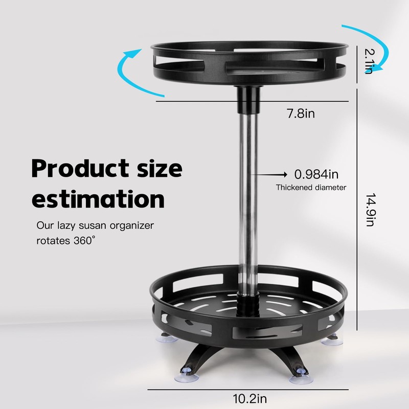 - Our lazy susan organizer rotates 360°, eliminating the need to rummage through your cabinets for a particular bottle or item and making your countertops look less crowded!