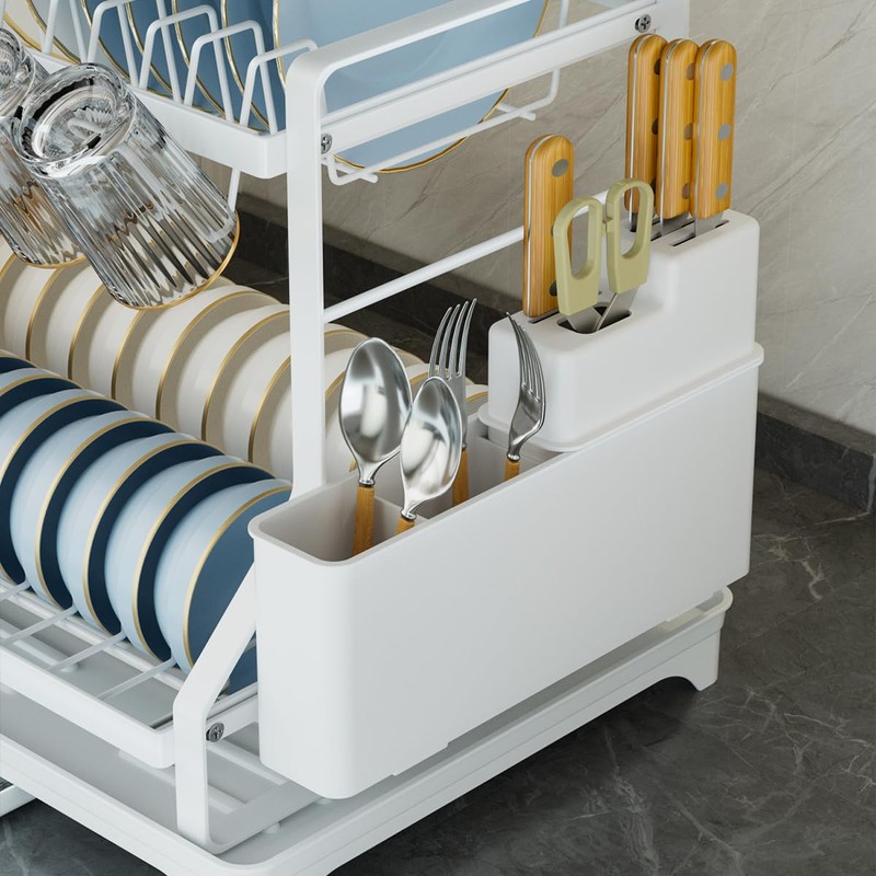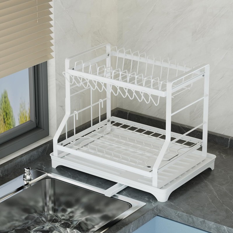 2-Tier Dish Drying Rack, White Metal Large, Space Saving Countertop Mount with Drainboard, Utensil Holder, 16.5x12.7x13.3 Inches