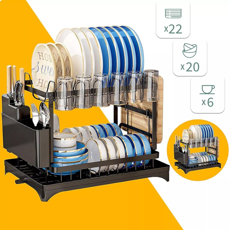 2-Tier Drying Dish Rack and Drain Board Set Utensil Holder Metal Kitchen Counter