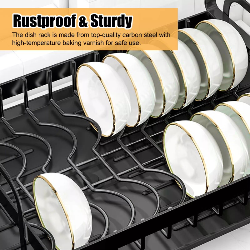 【Rustproof & Sturdy】The dish rack is made from top-quality carbon steel with high-temperature baking varnish for safe use. It is also resistant to rust, ensuring its long-lasting durability. The anti-slip foot cover at the bottom is designed to keep it stable and not easy to shake. It is durable and sturdy. No worry about the counter mess at all.