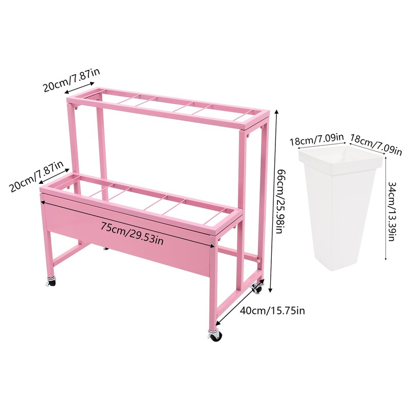 2 Tier Flower Display Stand with Square Buckets, Decorative Flower Holder Heavy Duty Rolling Plant Stand Plastic Buckets Iron Plant Stand with 4 Universal Wheel, Moving Bouquet Shelf for Florist Garden (6 White Bucket Pink Shelf)