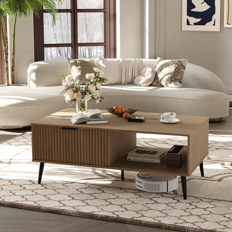 - Spacious Storage: Designed with functionality in mind, this coffee table features a generous compartment for storing books, cups, board games, and snacks, ensuring a clutter-free surface. ripple -patterned drawer door adds a charming farmhouse appeal while maintaining practical utility. The expansive tabletop measures 41.34''D x 21.65''W x 16.34''H, providing ample space to showcase decorative items and withstands a total weight of up to 80 lbs.