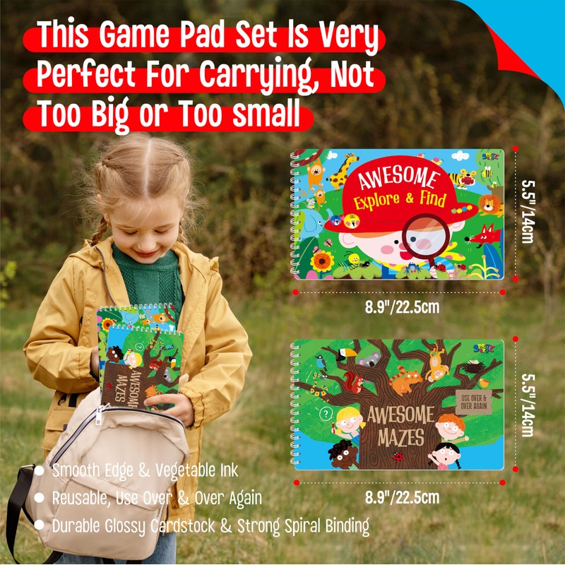 60 Reusable Activities: It comes with 2 dry-erase activity books (a travel game pad and a maze book), containing 60 games in total. It features various mazes and search-and-find games in different themes. You can get these diverting games once for all in 2 pads. Different game choices are waiting for you and your children, allowing you to enjoy hours of fun while bored.