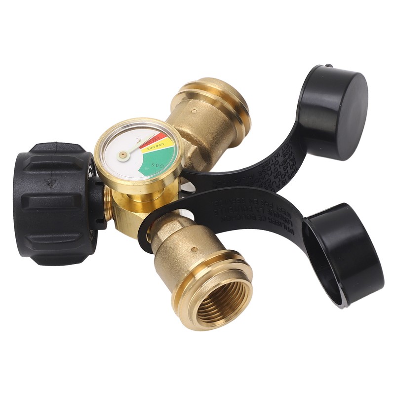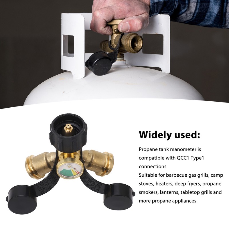 1、DUAL PROPANE HOSE SPLITTER: Equipped with two external threaded for Acme QCC1 (Type 1) connectors and a check valve, the propane splitter can only be used with one hose to prevent gas leakage. 2、CLEAR LEVEL INDICATOR: Designed with a 3 level indicator (red empty, yellow low, green full), the gauge helps you monitor the gas level clearly without removing the tank. 3、BRASS MATERIAL: Made of durable and reliable brass material, this propane hose Y splitter adapter ensures corrosion resistant and explosion proof performance, providing a long term use. 4、EASY INSTALLATION: No additional tools required, simply connect the regulator to the tank and hose using the propane splitter. Making your cooking experience easier. 5、WIDE APPLICATION: This propane tank pressure gauge is compatible with QCC1 Type1 connections, suitable for BBQ gas grills, heaters, deep fryers, propane smokers, lanterns, tabletop grills, and more propane appliances.