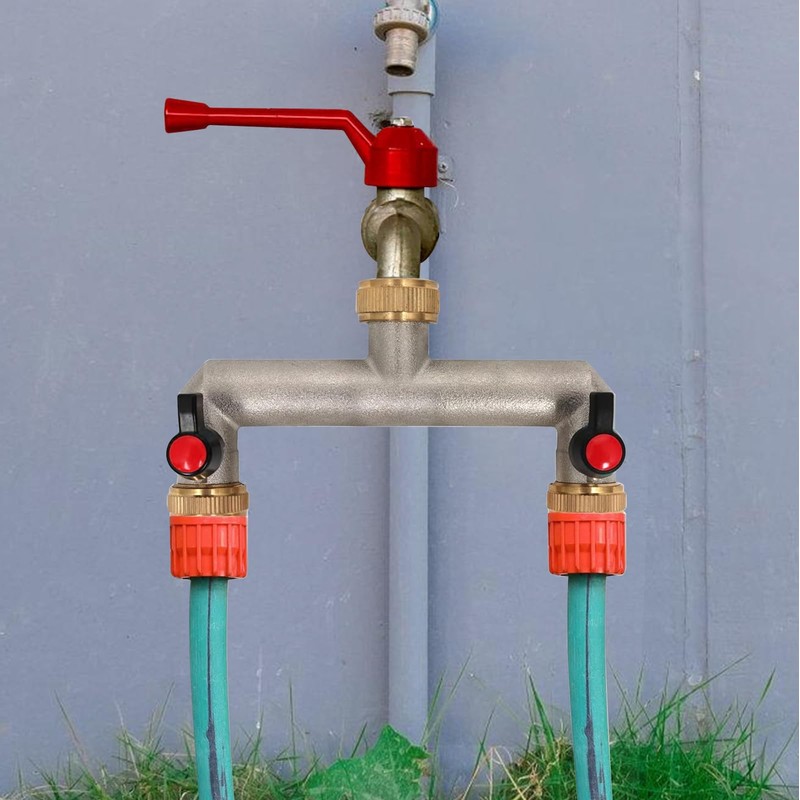 Dieser Verteiler Wasserhahn mit doppeltem Anschluss ist aus hochwertigem Messing gefertigt und verfügt über eine robuste, langlebige Konstruktion.