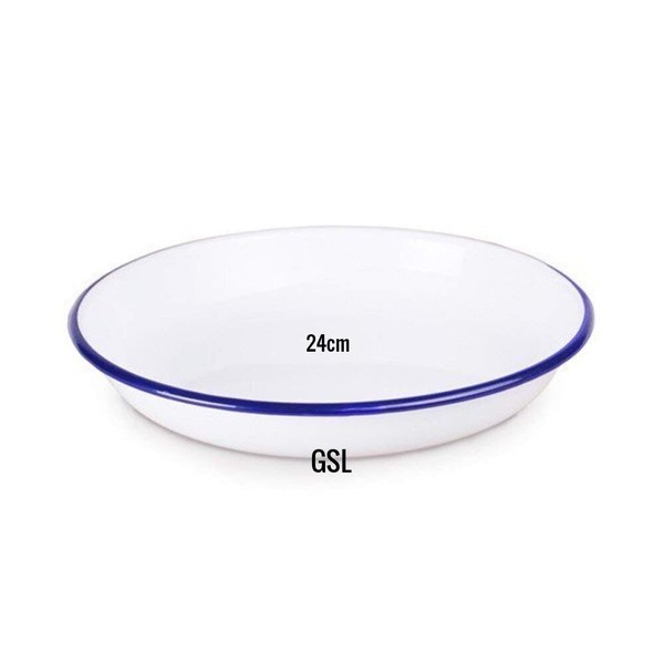 2 x 24cm Round White Enamel Blue Rim Pie Dishes