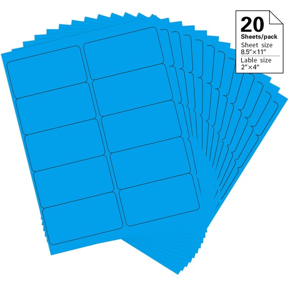 2" x 4" Colored Address Labels, 200 Bright Blue Label Stickers- Laser/Ink Jet Printer Mailing Labels, 8.5"x11" 20 per Sheet