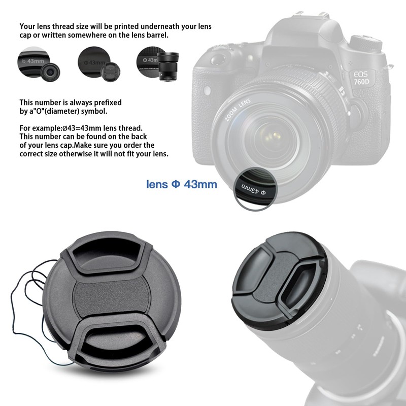 - Note: This cap is compatible with all 43 mm lenses. Please check the size of the lens thread of your camera before ordering. The size of the lens thread of your camera is marked somewhere on the lens housing or printed under your lens cap. This number is always preceded by a "Ø" (diameter) symbol. For example: diameter 43 = 43 mm lens thread size.