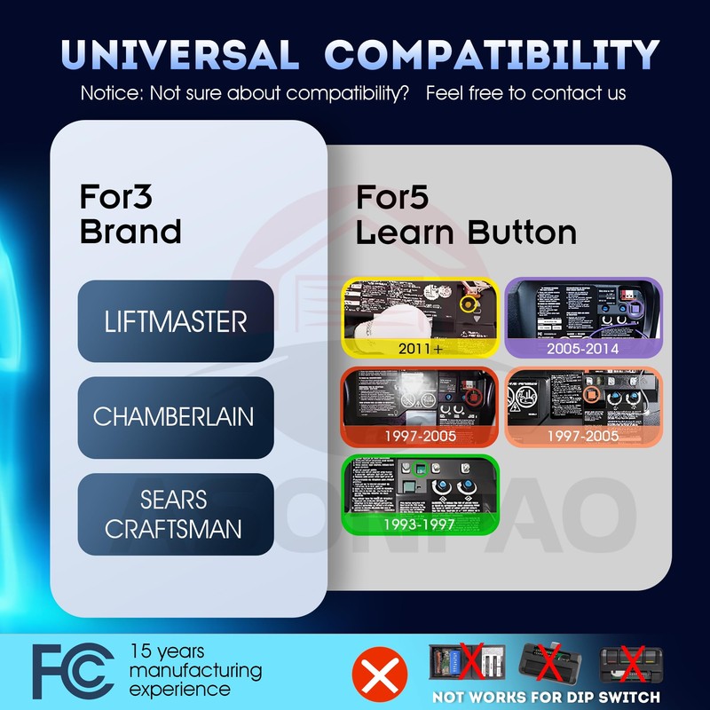 - **Universal Replacement**: Works for 1993-current Liftmaster/Chamberlain/Sears Craftsman garage door opener with a Yellow, Purple,Red/Orange,Green Learn button. Attention:Not support dip switch garage door opener!!!