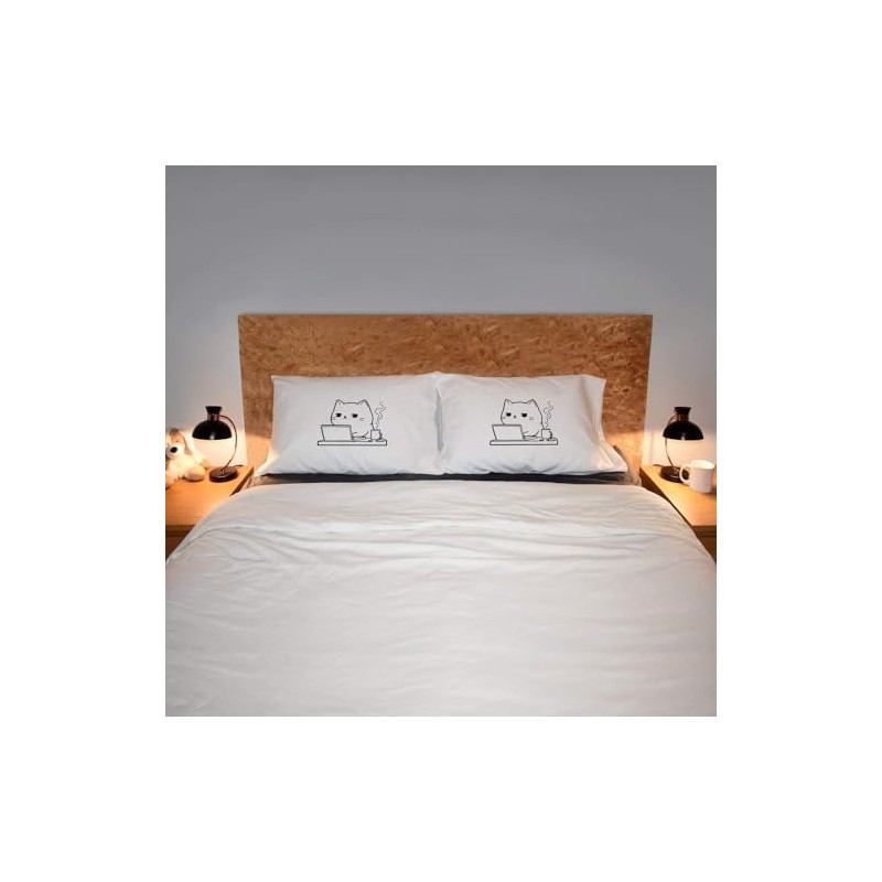 2 x 'Exhausted Cat Working with Coffee' Cotton Pillow Cases (PW00040645)