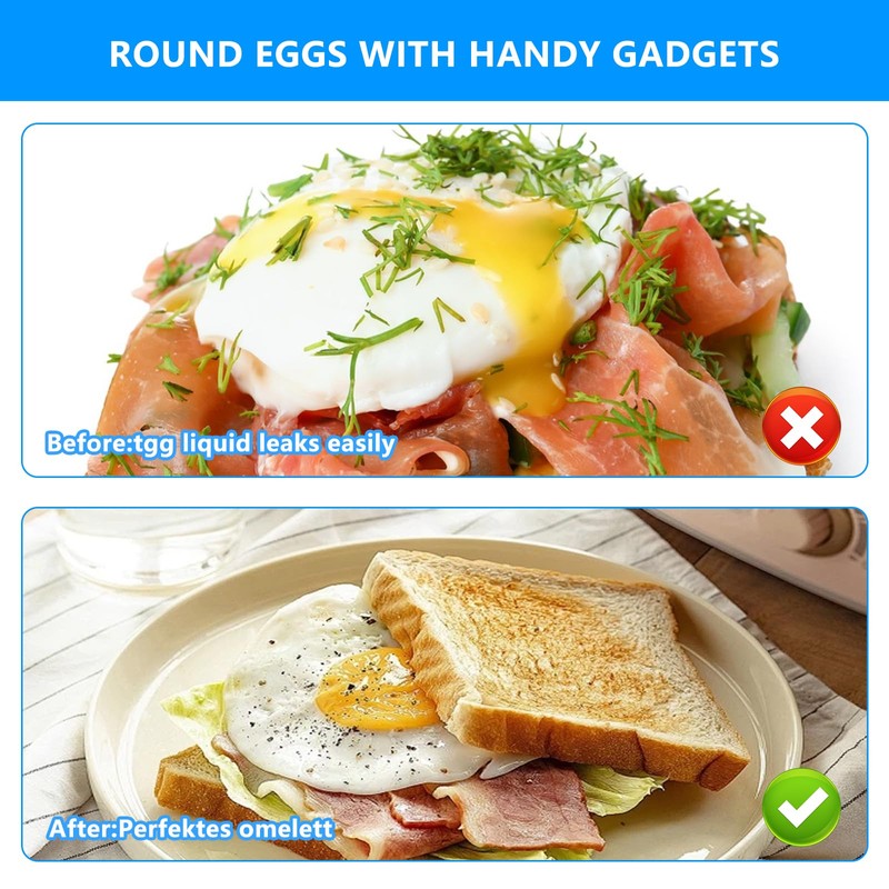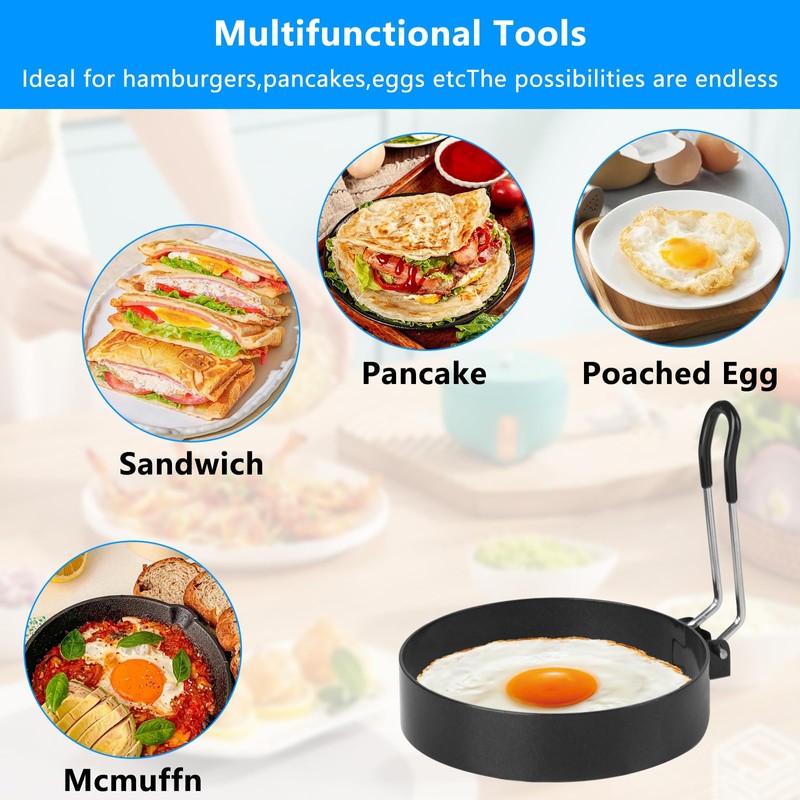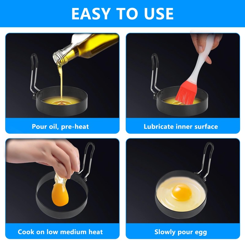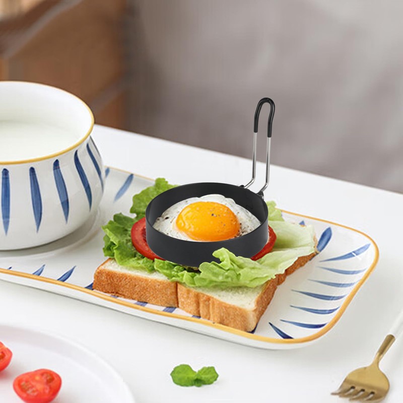 - Adjustable handle: fried egg moulds for the pan has a folding handle with adjustable angle to avoid burns to the hands and simplify operation. Helps turn or grill for more even heating.