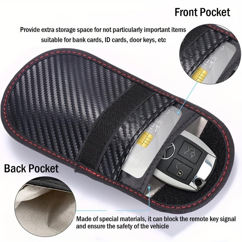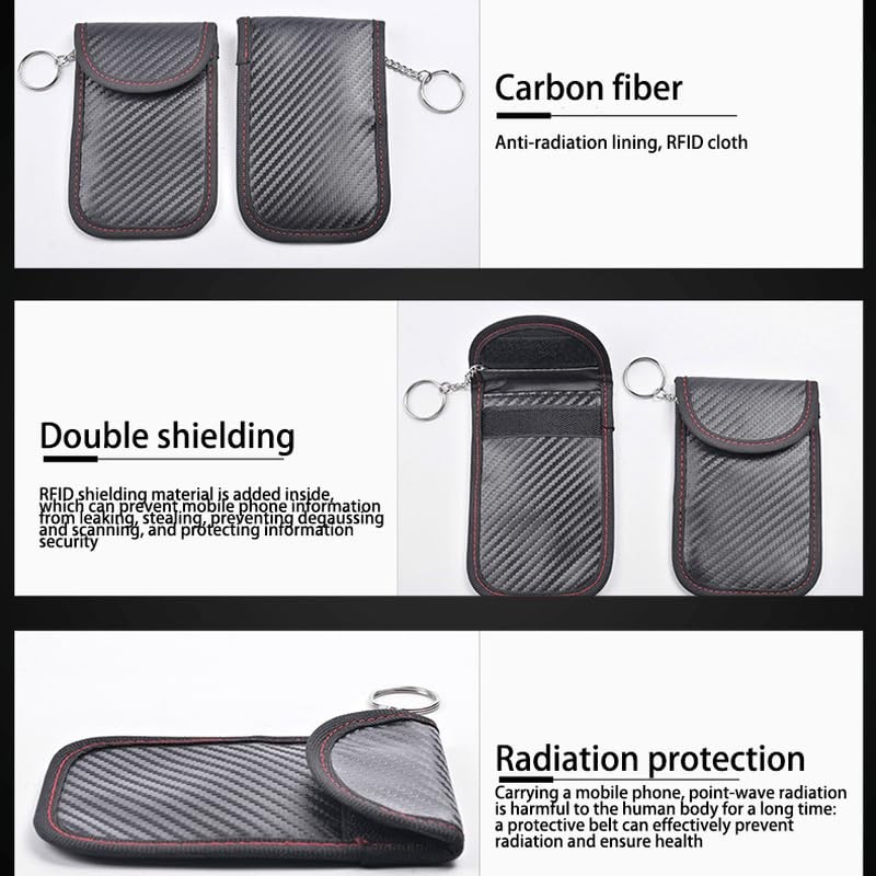- 🛡️ SHIELD YOUR KEYS AND CAR: Our key bag is like a shield made of premium carbon fiber material that blocks unwanted signals. It stops phone calls, messages, Wi-Fi, and more. It fits all key fob sizes and protects both your car and credit cards. Just put your car key in the bag, and it's safe from digital threats.