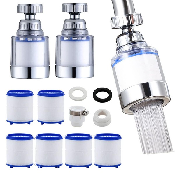 2 x Tap Filter, 360° Water Filter Tap with 6 Pieces PP Cotton Filter Element, Tap Descaler Attachment, for Kitchen, Home, Bathroom, Sink