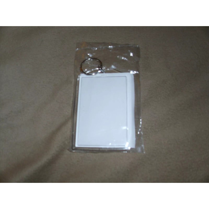 A 2.5"x3.5" Photo Keychain that can hold photos up to about 2"x3". Has a 1" diameter detachable keyring.
