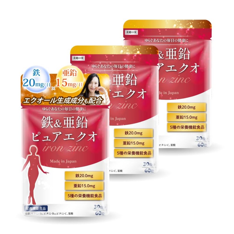 ・【現役女性医師と共同開発した鉄と亜鉛のサプリメント】美容医療が専門の現役の女性医師と共同開発した鉄と亜鉛のサプリメントです。さらに、ゆらぎ世代の女性にうれしいエクオール生成成分も配合しています ・【業界最高水準量の鉄と亜鉛を配合】現役医師の指導の下、鉄分を20㎎、亜鉛を15㎎配合した鉄と亜鉛サプリメントの決定版です ・【鉄と亜鉛を効率よく吸収】鉄と亜鉛を効率よく吸収するためにビタミンCを100㎎とクエン酸を配合しました。また、ミネラル成分豊富な竹炭末を配合し、吸収率だけでなく飲みやすさも実現したサプリメントです ・【5種の栄養機能食品(亜鉛・ビタミンC、ビタミンB6、ビタミンB12、葉酸)】 鉄&亜鉛ピュアエクオは、亜鉛だけでなく、ビタミンC、ビタミンB6、ビタミンB12、葉酸の5種の栄養機能食品です。女性にうれしい成分を贅沢配合しています ・【サプリメントの安全性】弊社では使用している全成分について製造工場にて品質や安全性の調査を実施しております。また、国内GMP認定工場で製造しておりますので安心してお召し上がりいただけます