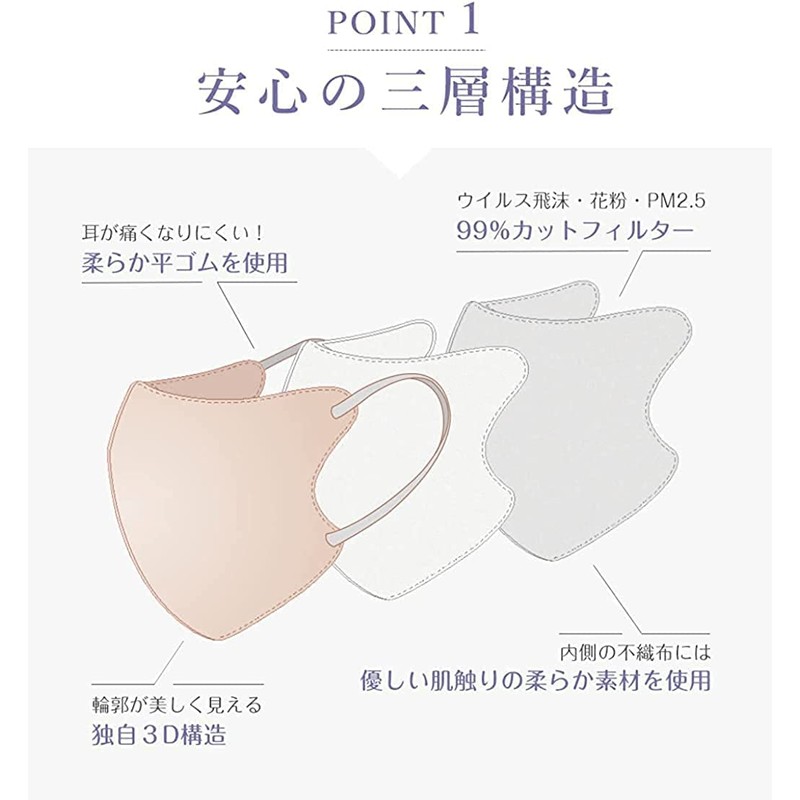 【製品仕様】cタイプ(約)13.8cm×11.3cm【材質】ポリプロピレン【内容】10枚入り×2【有効期限】2年 【流行りのバイカラー】流行りのバイカラーで女子力UPスタイリッシュな自分に、マスク生活の気分転換に活用 【通気性改良3層タイプ】独自3D形状によって、くちもとの空間を広く保ち、息がしやすく快適な状態をキープできるように工夫し、通常のマスクより通気性が通常の約1.7倍アップされ、マスクの蒸し暑さから解放します 【極柔らかゴム紐採用で耳が痛くならない】ふんわりとやわらかい素材で耳への負担を軽減します一日10時間以上仕事中にマスクを付けても耳が痛くなりません 【カケンテストセンターで検査済】極細繊維素材で微小粒子をカットメルトブローン不織布を使用、3層フィルターで構成され、花粉・ホコリ・PM2.5、ウイルス飛沫を99%カットします(マスクは感染を完全に防ぐものではありません) 【小顔効果抜群・カップルやお友達とお揃いで使用】独自な3Dデザインで小顔効果抜群です10枚入り×2パックであるため、開封後にも衛生的に保存可能ですかわいいパッケージでギフトにもピッタリです家族またはお友達とお揃いで快適に夏を過ごしましょう