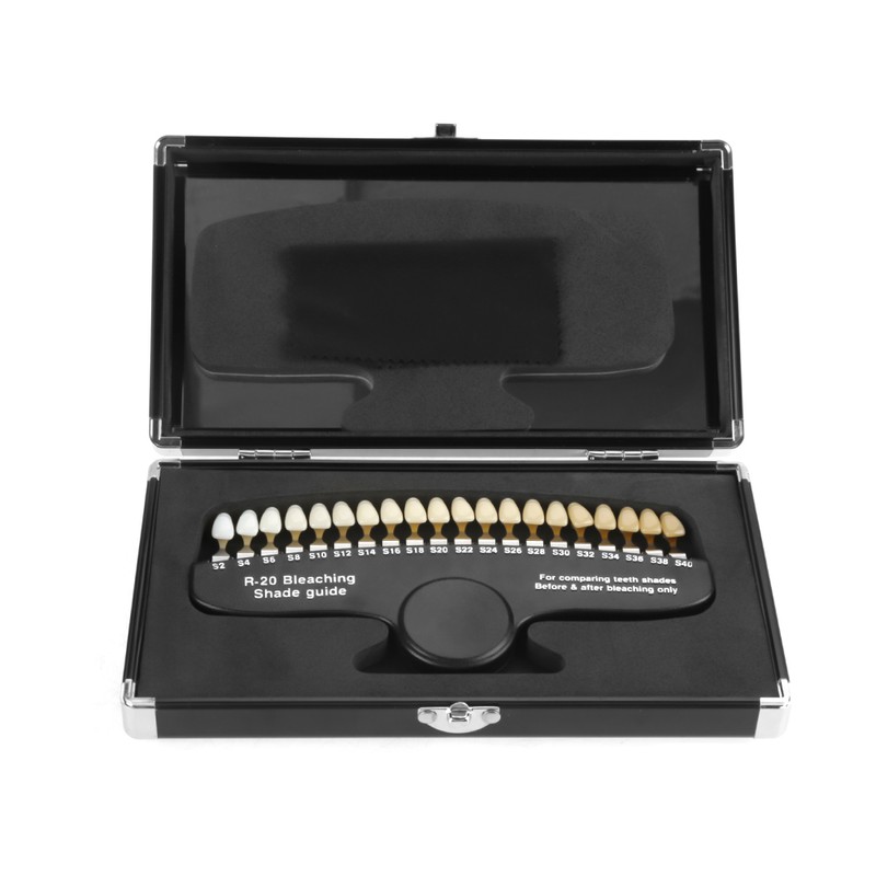 1、Self-explanatory, easy to use, convenient to compare. 2、20 Colors shades with engraved numbering for longer use. 3、Quick, secure and precise shade determination. 4、For comparing teeth shades before & after bleaching. 5、Comes in stylish aluminum case, portable and easy to keep.