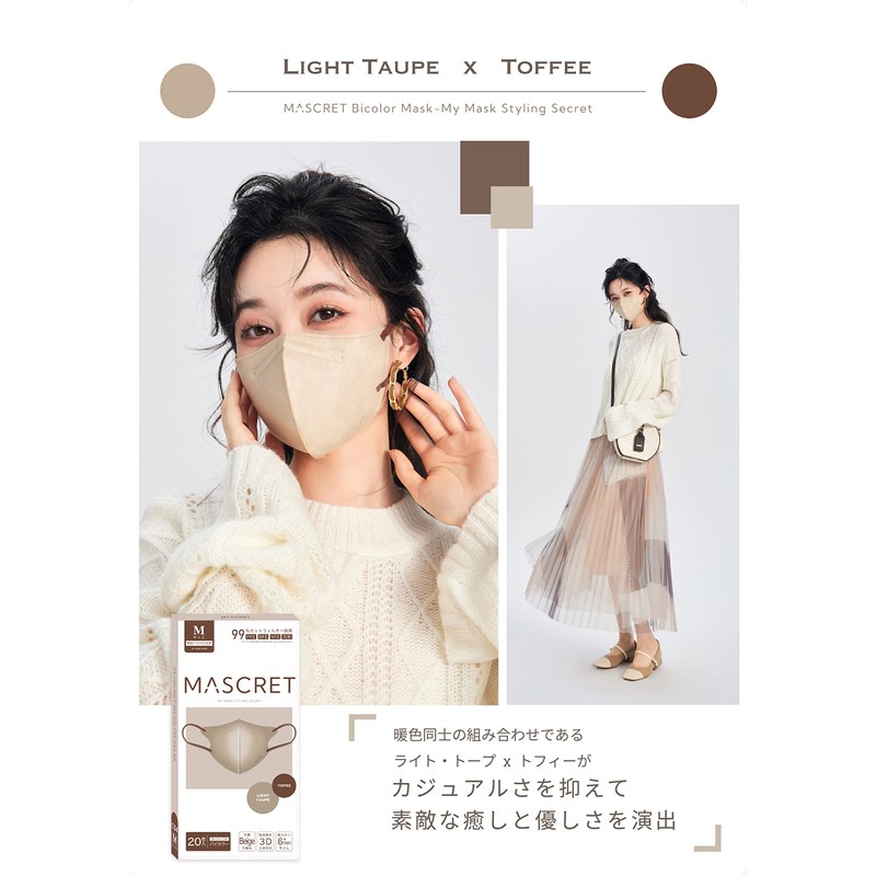 - ■【バイカラー】バイカラーマスクを取り入れて、いつもとは違うコーディネートを楽しんでみて、自分の正直な気持ちにフィットしましょう。詳しくは「カラーバリエーション」をご参照ください。