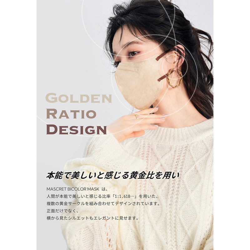 - ■【審美的なデザイン】MASCRET BICOLOR MASK は、人間が本能で美しいと感じる比率「1:1.618…」を用いた、複数の黄金サークルを組み合わせてデザインされています。正面だけでなく、横から見たシルエットもエレガントに見せます。