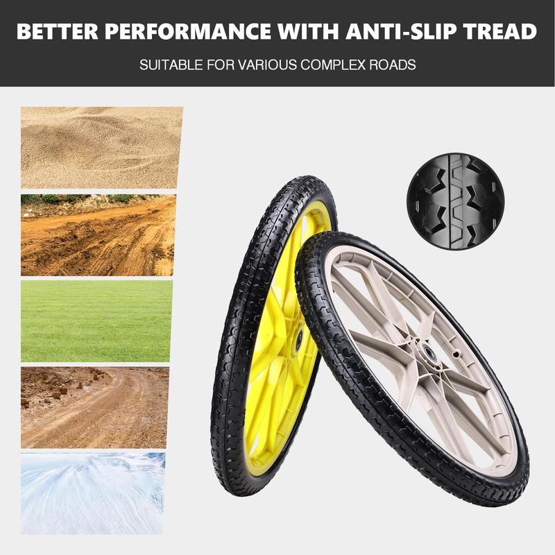 • 【20" FLAT-FREE TIRE 】The solid air-less tire is made of Superior quality polyurethane, provide long-lasting performance and reliability.Come with adapter kit which makes it easier for you to install and use the tires.Helping you to do your job better without worrying about Flat tire problems.