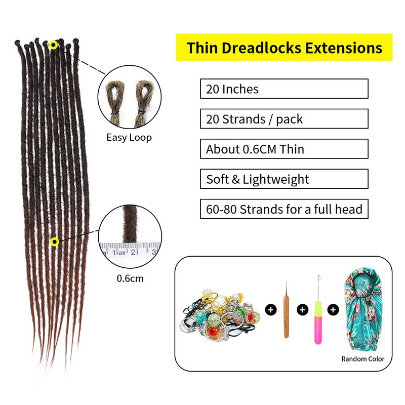 • Features: Many colors dreadlock extension optional. 20 inch synthetic dreads about 0.6cm thick, about 3.5g/strand, thin and lightweight, about 60-80 strands for a full head.