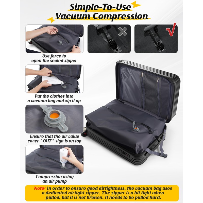 - Electric Vacuum Pumps: The vacuum travel suitcase sets come with a portable electric vacuum pump for easy carrying on the go. It also comes with a variety of pumping port accessories, which can meet different pumping needs, whether it is to quickly compress your luggage or adjust the packing space, it can provide you with great convenience.(ps: Fully charged, can be used anytime, anywhere, say goodbye to the trouble of finding a power source.)