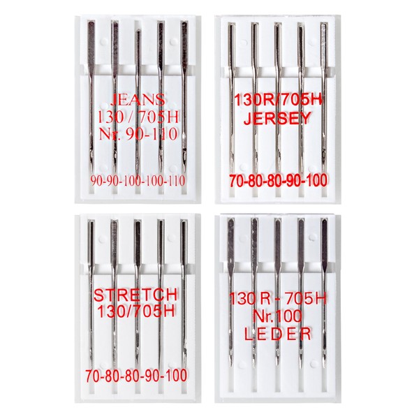 20 Nähmaschinennadeln: Jeans, Jersey, Stretch und Leder; je 5 Stück/Sorte in Verschiedenen Größen; System: Flachkolben (130R/705H)