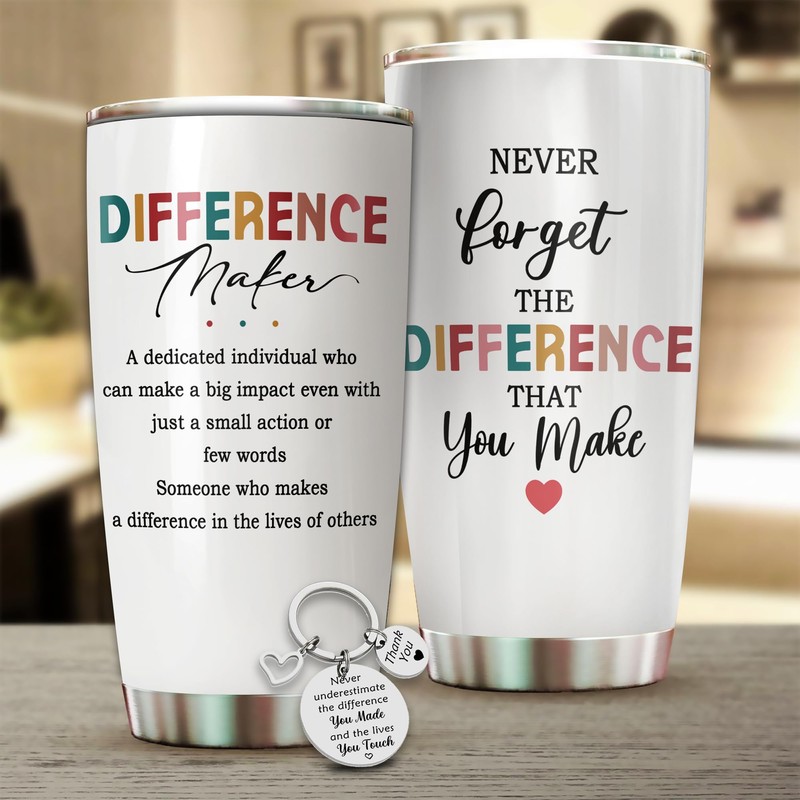 - 1Difference Maker Gift for Women - Looking for the perfect difference maker gift that shows genuine admiration and appreciation? This 20 oz stainless steel tumbler is an ideal choice. Whether it's for making a difference gifts for your best friend, coworker, or an important woman in your life, this tumbler is a beautiful way to say thank you for all the positive impact they bring. Perfect for celebrating those who go above and beyond with you make a difference gifts that last all day, every day.