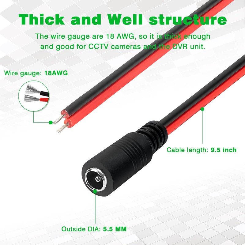 - 12V Female Pigtail Provides a simple DIY solution for DC power connectivity, compatible with all CCTV systems and other 5.5 x 2.1mm DC power devices, like led driver, strip connector, CCTV Camera.