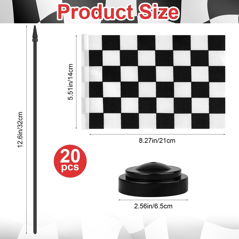 the black and white stick flags size is 8.27 x 5.5 inches, rod size is 12.6 inches; Add a pop of color to your indoor decor with our checkered racing stick flag, which is lightweight and easy to assemble.
